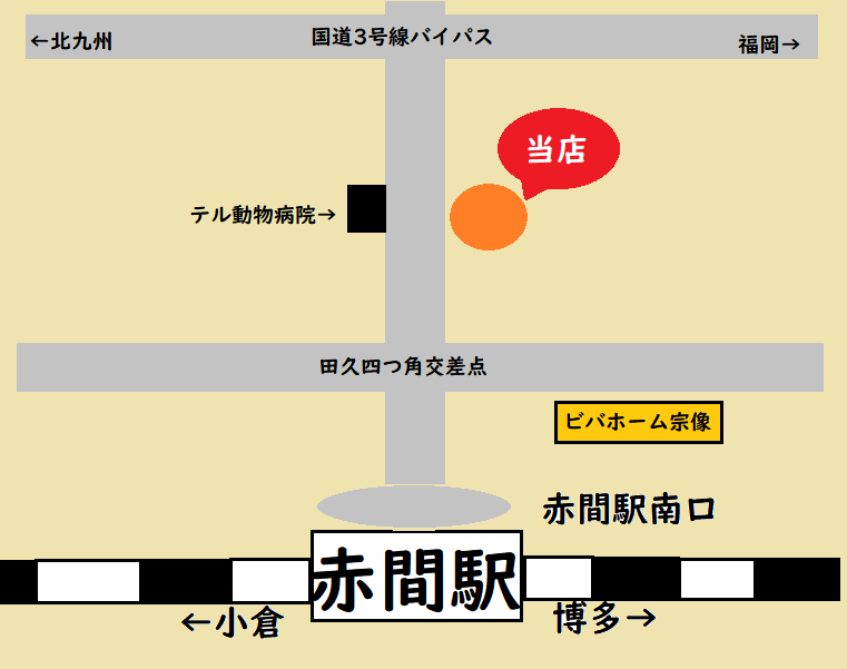 国道3号線自由ヶ丘出口でおりたら、赤間駅方面にすすみ左側にお店があります。向かい側動物病院です